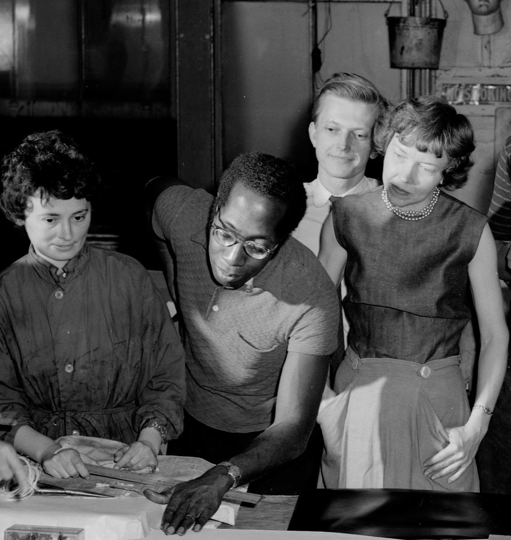 His most recognized legacy, however, is the Printmaking Workshop he opened with Will Barnet in the late 40s. Run as a cooperative, the workshop gave artists access to training, the space and technical support to experiment with printmaking processes, and it encouraged innovative approaches to a medium that was slowly gaining recognition and acceptance as a major art form. The Robert Blackburn Printmaking Workshop had a liberal structure that served as a welcoming hub to people of all backgrounds. It was always full of notable artists and students and had a major impact on American art. The Workshop’s contributions extend to the preservation of Black arts. Many works on paper by Black artists currently in American art museums (including the Baltimore Museum of Art) are later prints that Blackburn prepared of his colleagues’ earlier work.